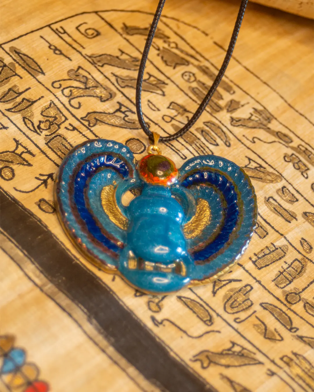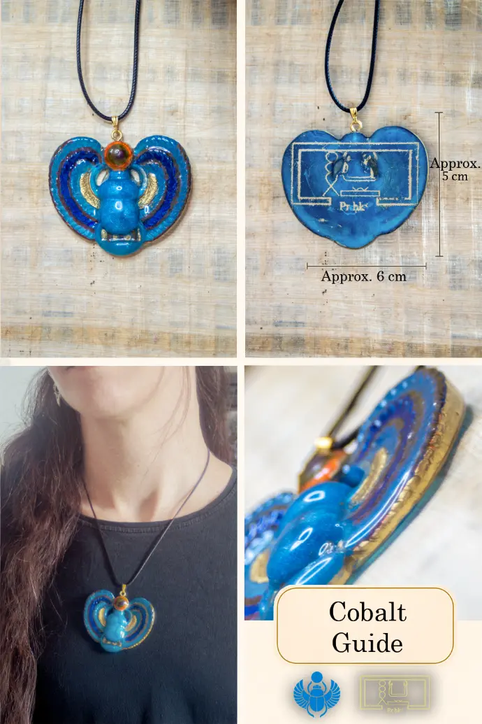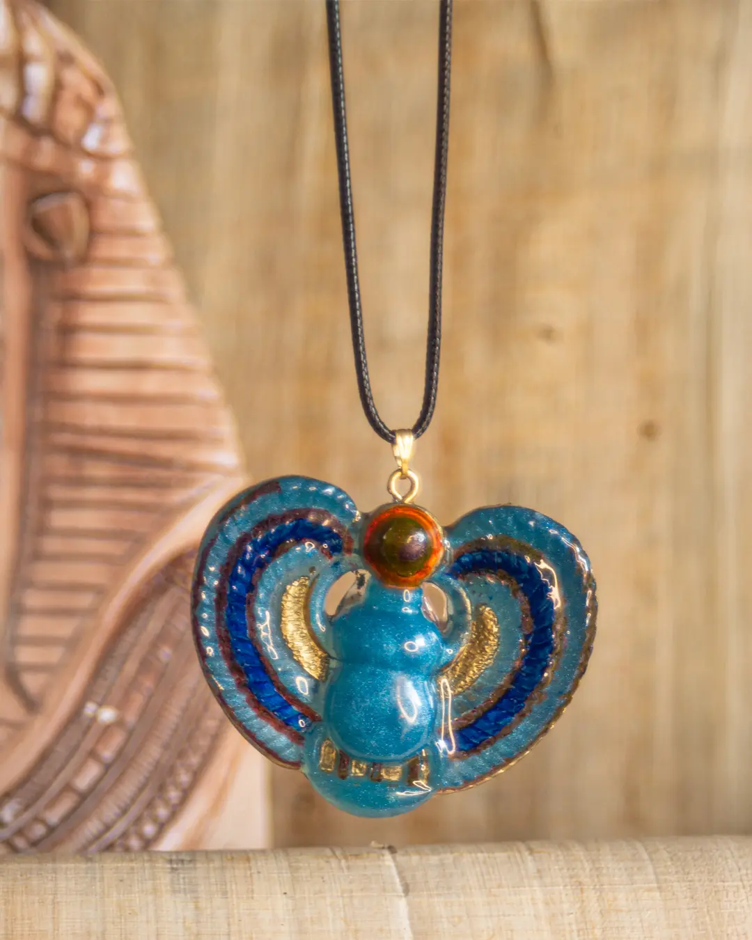 Handmade scarab necklace in cobalt blue resin with golden flakes, inspired by the celestial protectors of Ancient Egypt.