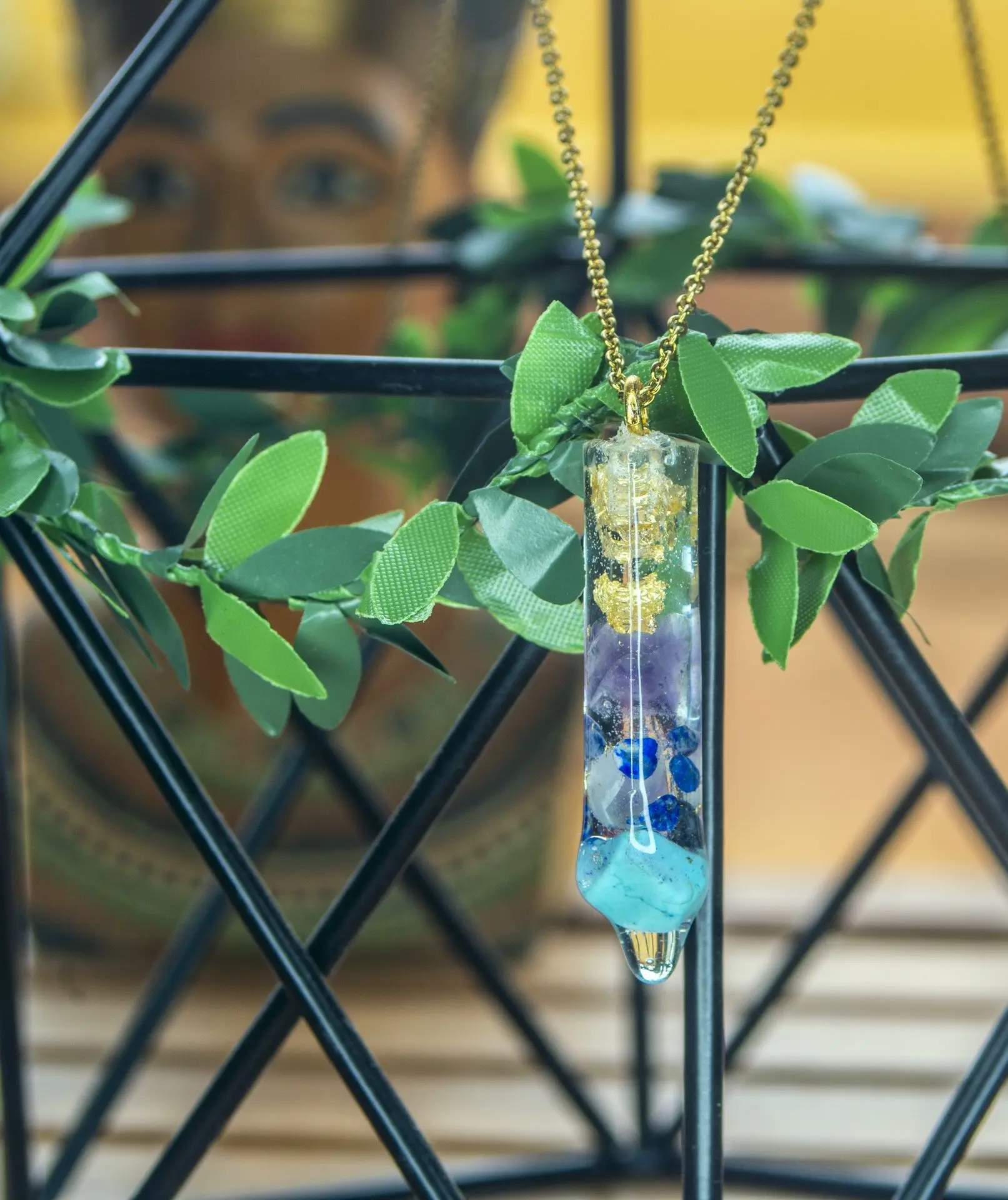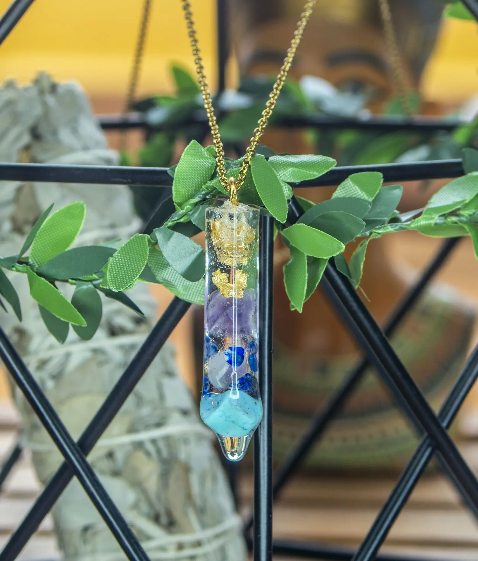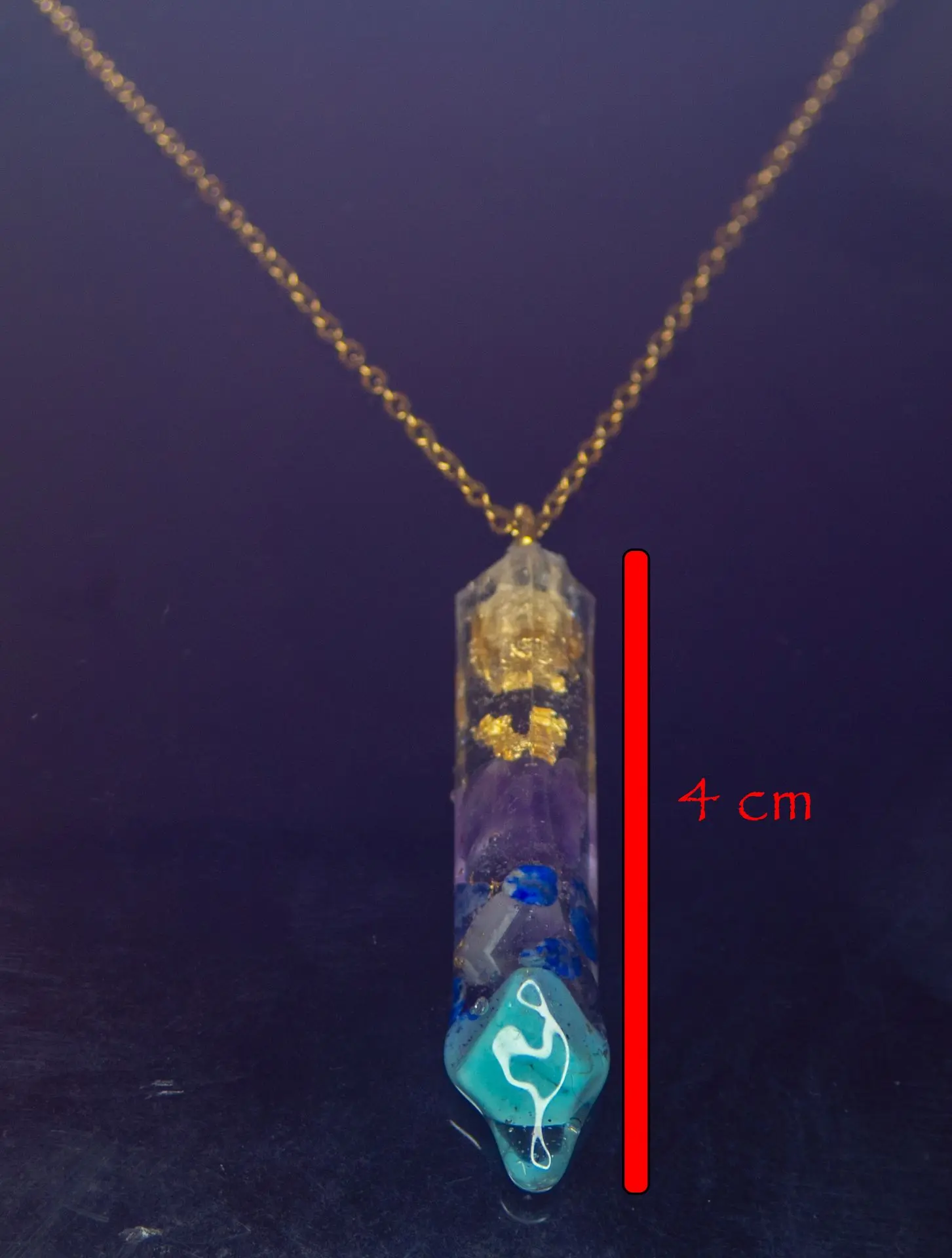 Resin pendant encapsulating some of the most commonly used stones in ancient Egypt, such as turquoise, lapis lazuli, and amethyst, decorated with gold foil details.