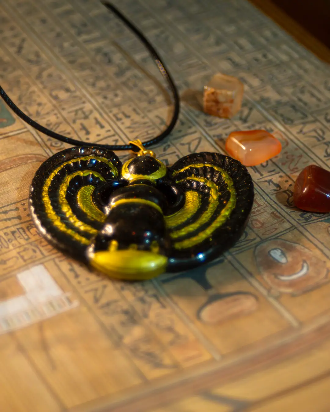 Its black and gold tones evoke the nightly journey of the god Ra through the underworld, a symbol of protection, transformation, and contained energy.
