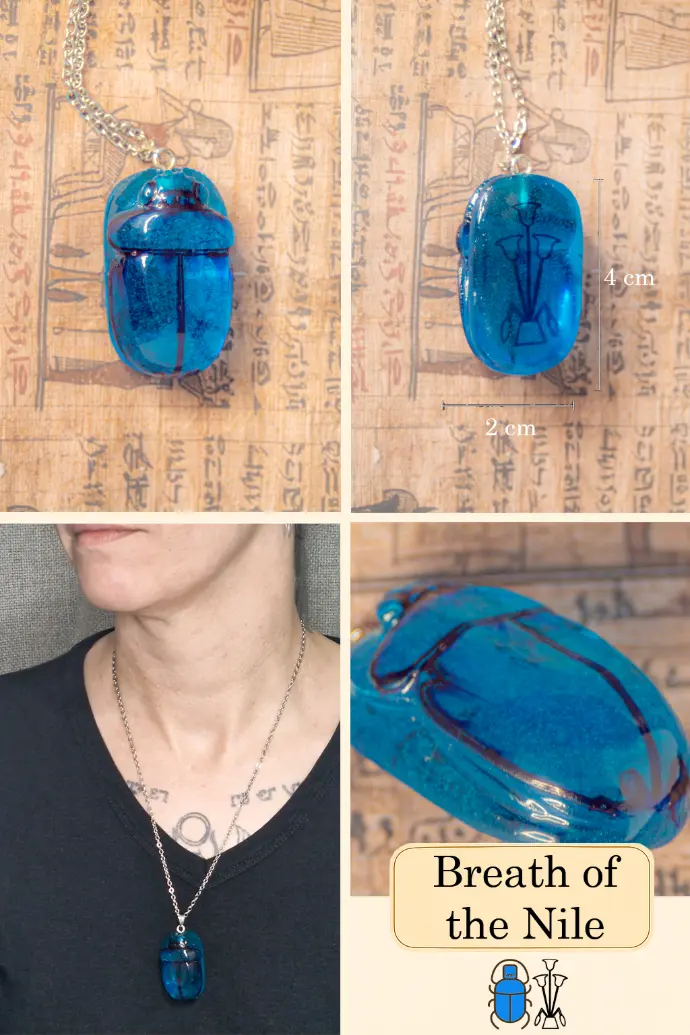 Its intense, watery blue evokes the sacred waters that gave life to Egypt, while the scarab beetle—the quintessential solar symbol—protects the wearer's path and renews their energy day after day.