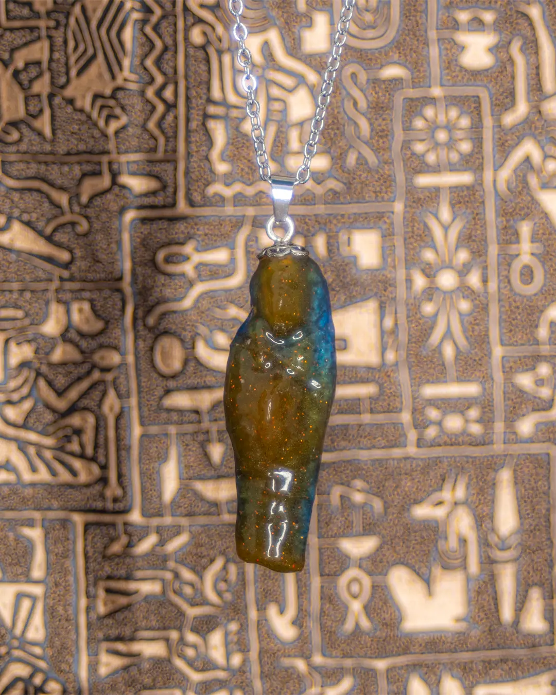 Echo of the Nile is a pendant inspired by the ushabtis of Ancient Egypt, reinterpreted in tones that evoke the deep waters of the river and the golden sediments that fertilized its banks.