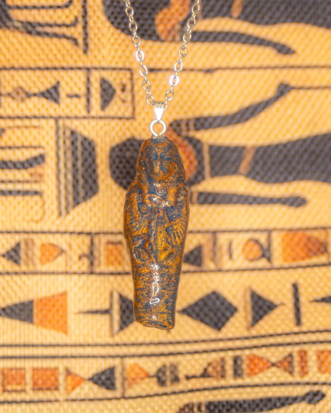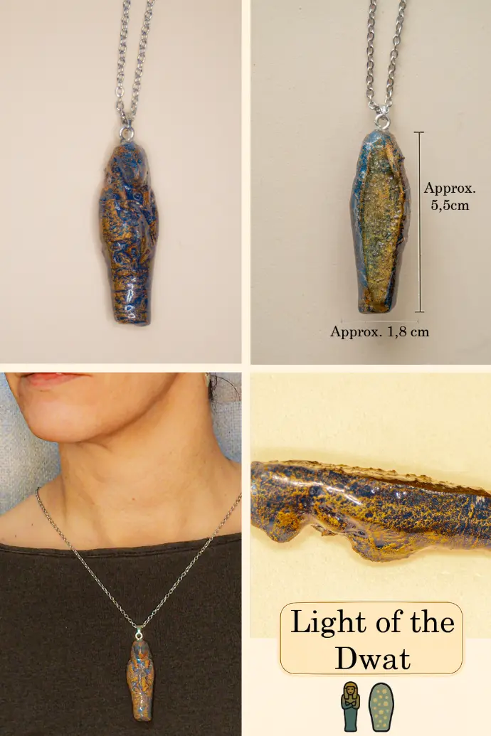 “Light of the Dwat” is a necklace inspired by the profound radiance of the Egyptian underworld. The ushabti combines nocturnal blues and earthy golds, evoking torch-lit sands and the hidden passages of burial chambers..