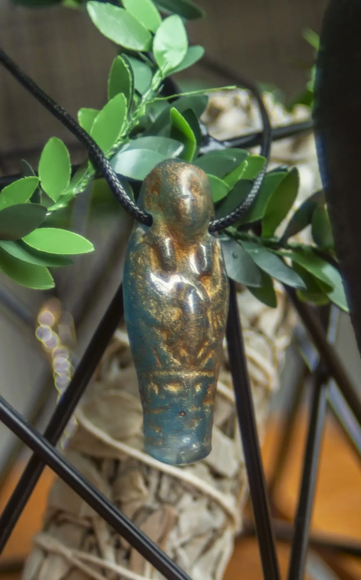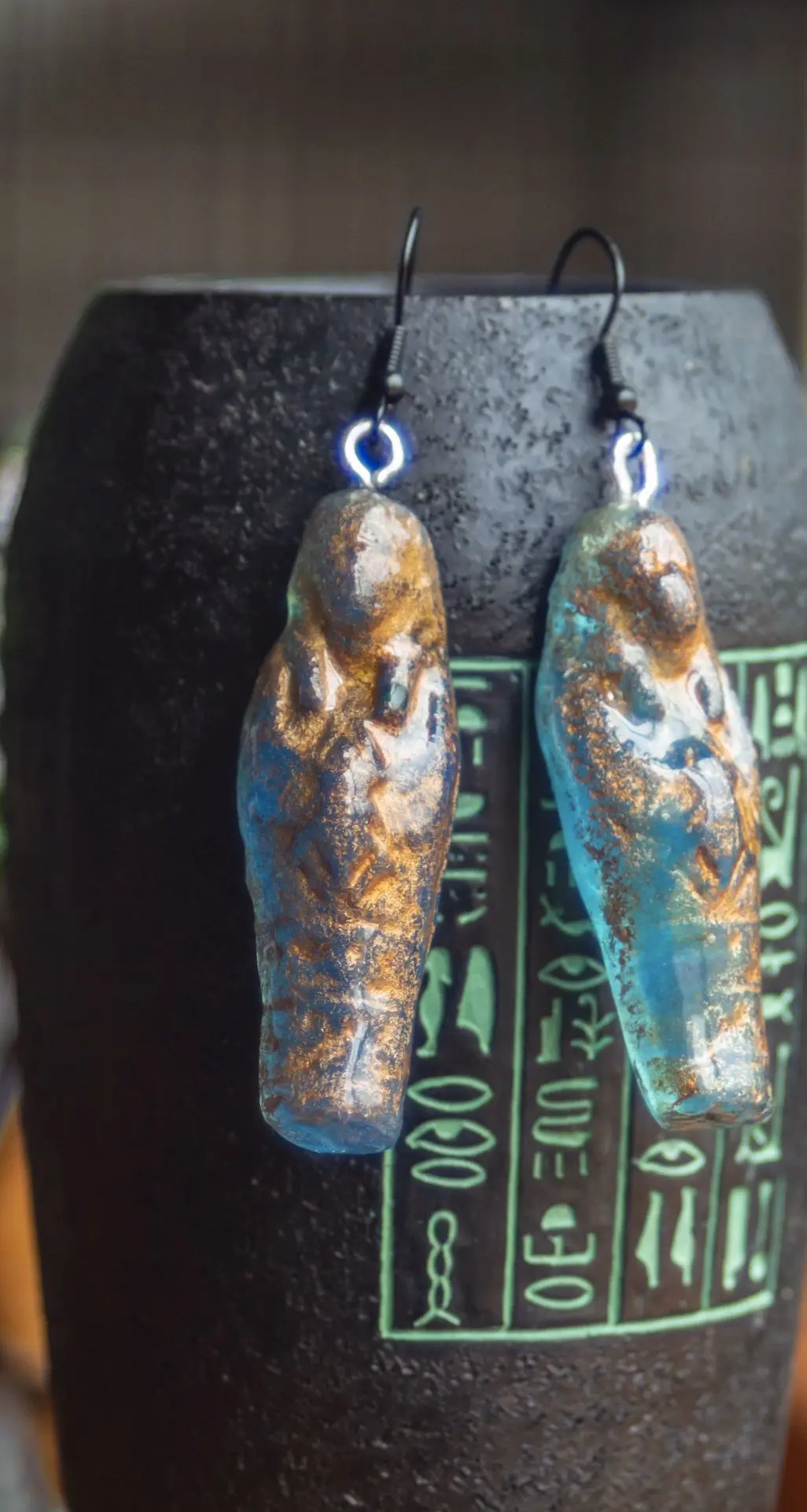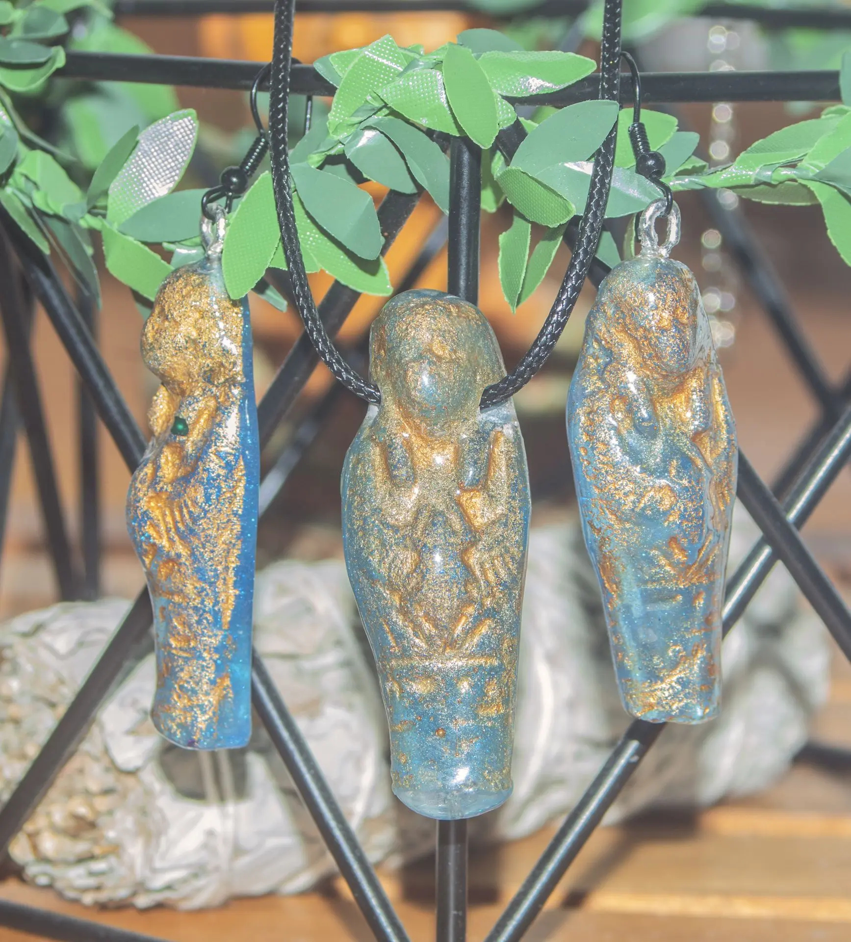 Conjunto de collar y pendientes Ushebtis del antiguo Egipto, elaborado en resina con detalles dorados.