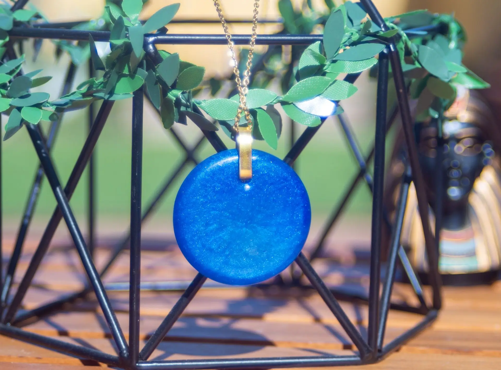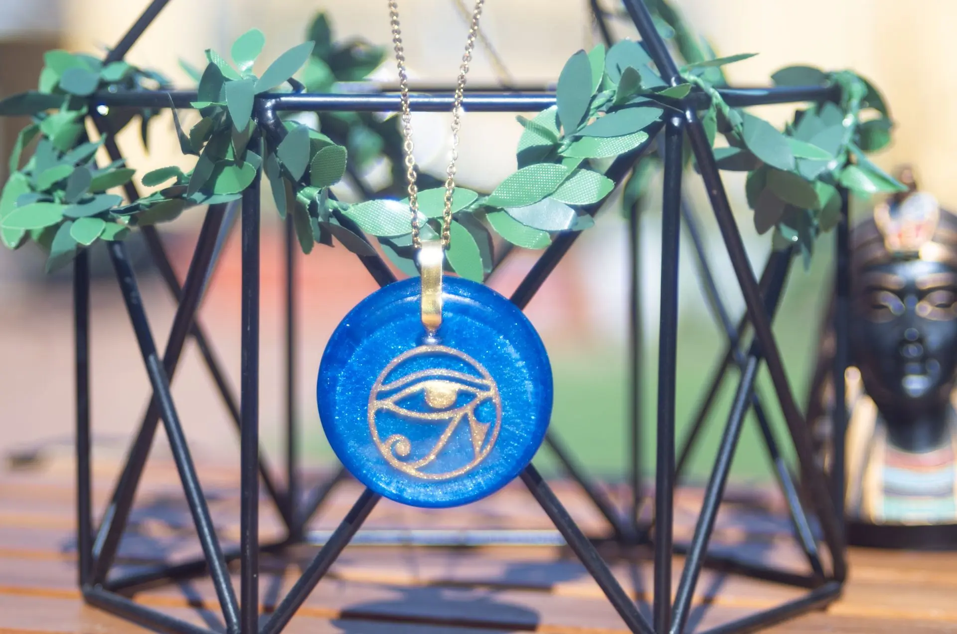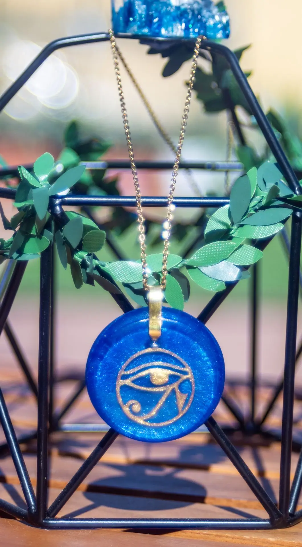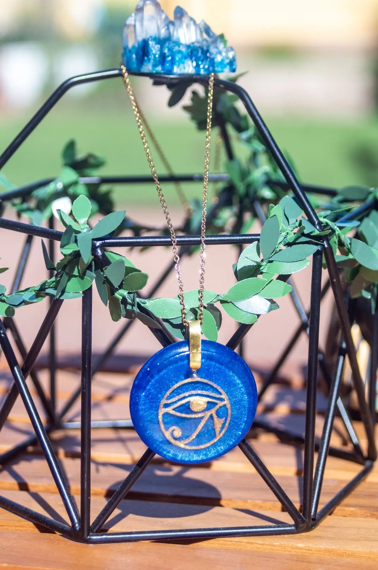 Ojo de Ra dorado encapsulado en resina azul, con collar en acero inoxidable dorado