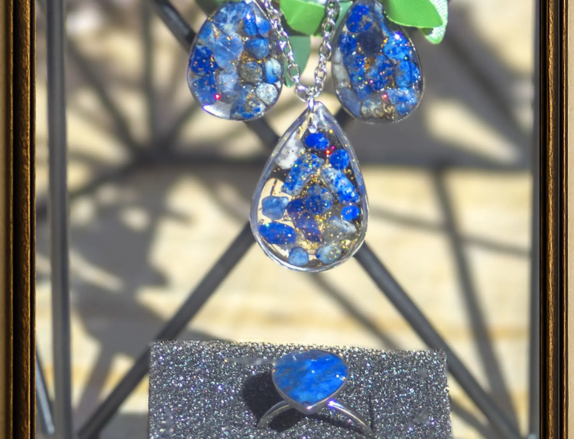 Juego pendientes, collar y anillo con lapislázuli, en forma de gota de agua